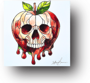 Lying ominously on a bed of dark, crumpled leaves, the bright red apple gleams with an unsettling allure. Its surface, smooth and inviting, is marred by a chilling detail: a faint, ghostly skull seems to emerge from the fruit's glossy skin, its hollow eyes and grinning teeth barely visible but undeniably sinister. The apple's vivid redness contrasts starkly with the eerie skull, hinting at a deceptive sweetness that masks a deadly intent. The apple's menacing beauty raises a haunting question—who is the intended recipient of this treacherous gift? The answer lingers in the air, as chilling and enigmatic as the skull that peeks through the fruit's alluring facade.